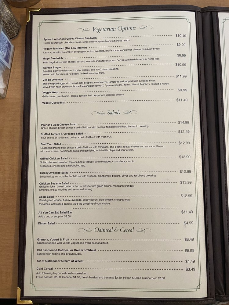 Choice of turkey bacon or sausage with eggs. Eggs served in various styles, including scrambled, poached, or sunny-side up. Multiple potato and side options, such as hash browns, sweet potato fries, pancakes, or seasonal fruit.